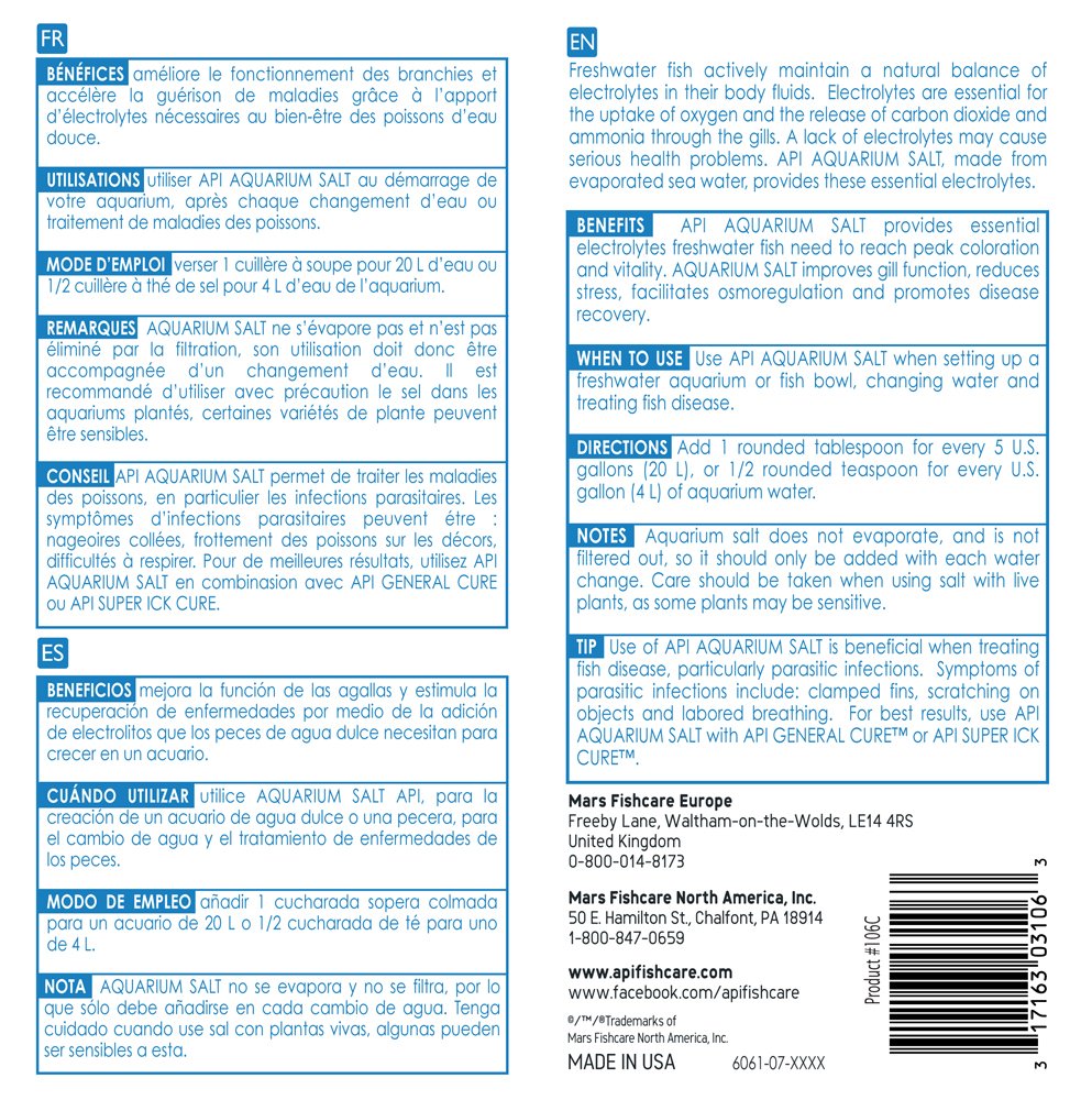 - Contains one (1) API AQUARIUM SALT Freshwater Aquarium Salt 67-Ounce Box