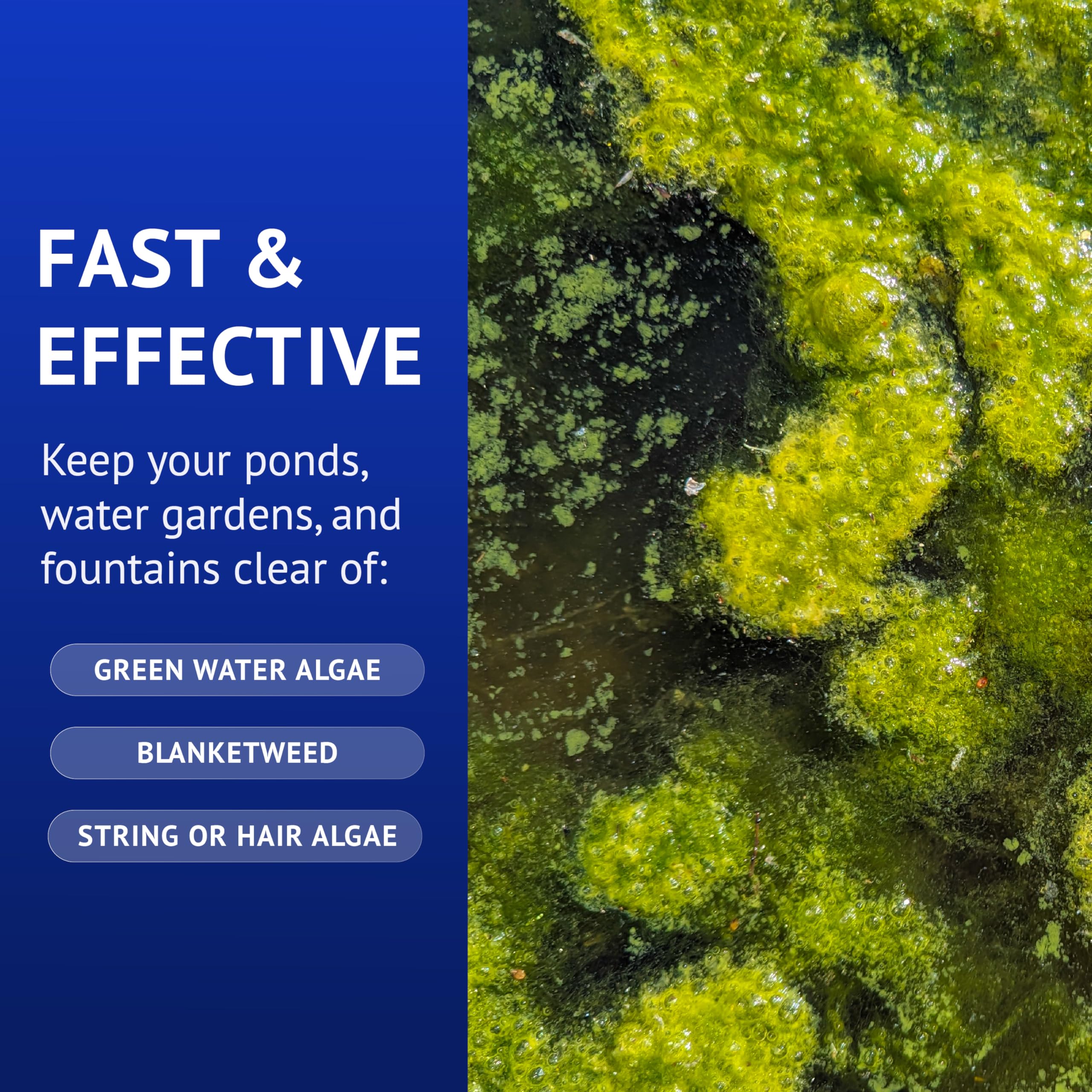 - Fast and Effective – Controls most types of algae, including green water (Chlorella), string and hair algae (Cladophora), blanket weed algae (Oedogonium) in ponds, koi ponds, and fountains